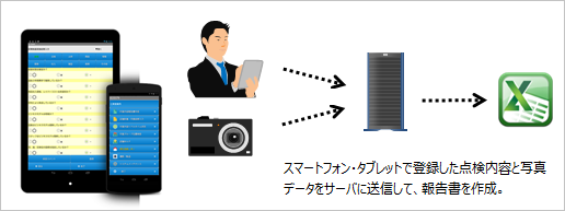 スマートフォン搭載のカメラで現場写真を取ると、点検内容と写真データをサーバで関連付けさせ、EXCEL形式の報告書に出力ということが可能です。